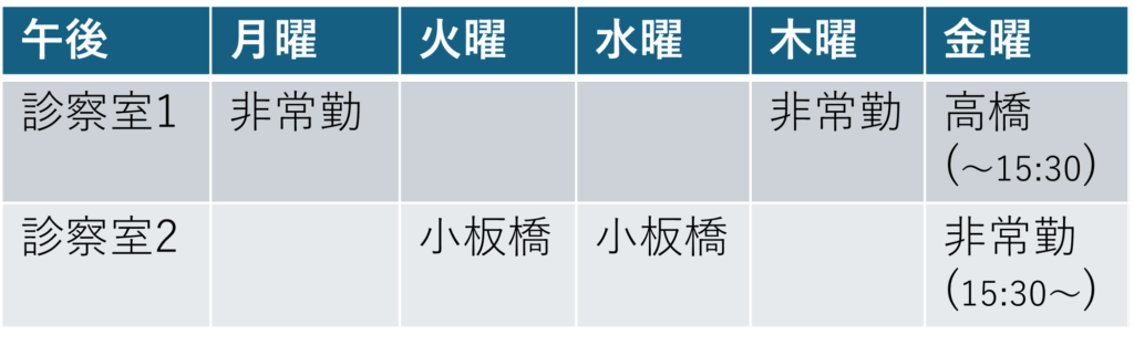 ※上記は2026/1に変更となった、現在の診療状況です。事情により臨時休診となる場合のほか、混雑状況・診療内容によって、記載外の医師による対応があります。直近の休診情報は、お手数ですが病院代表(0186-23-4131)までお問合せください。